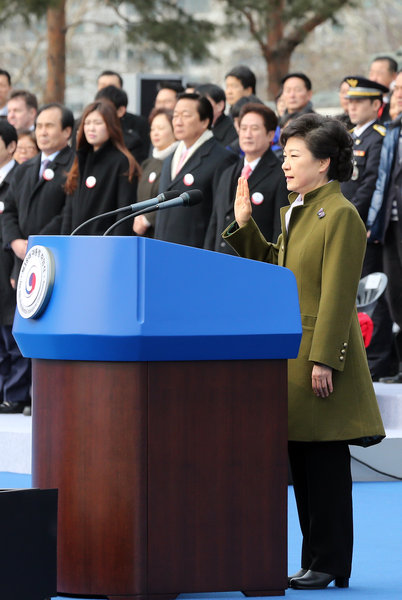 2013年2月25日,韩国首尔,韩国首位女总统朴槿惠在就任仪式上宣誓就职。