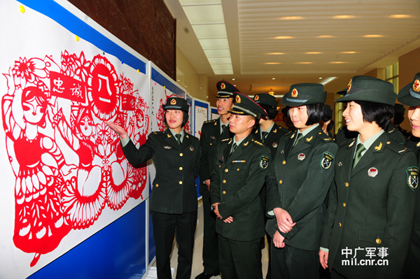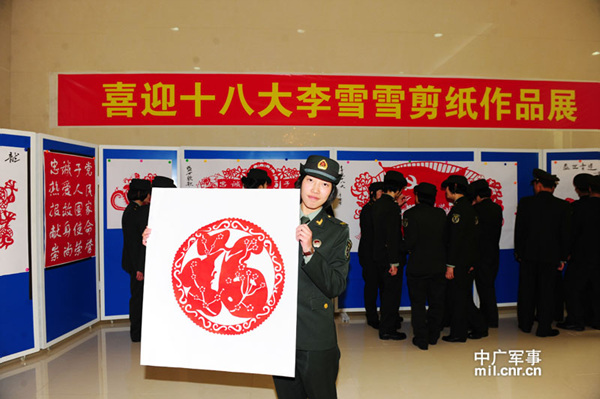 中广网拉萨9月27日消息 9月26上午,西藏军区某旅大礼堂人头攒动,该旅通信连女战士李雪雪个人“喜迎十八大剪纸作品展”在这里如期举行。在展厅里,前来参观的官兵被展板上一幅幅精美的剪纸深深的吸引。